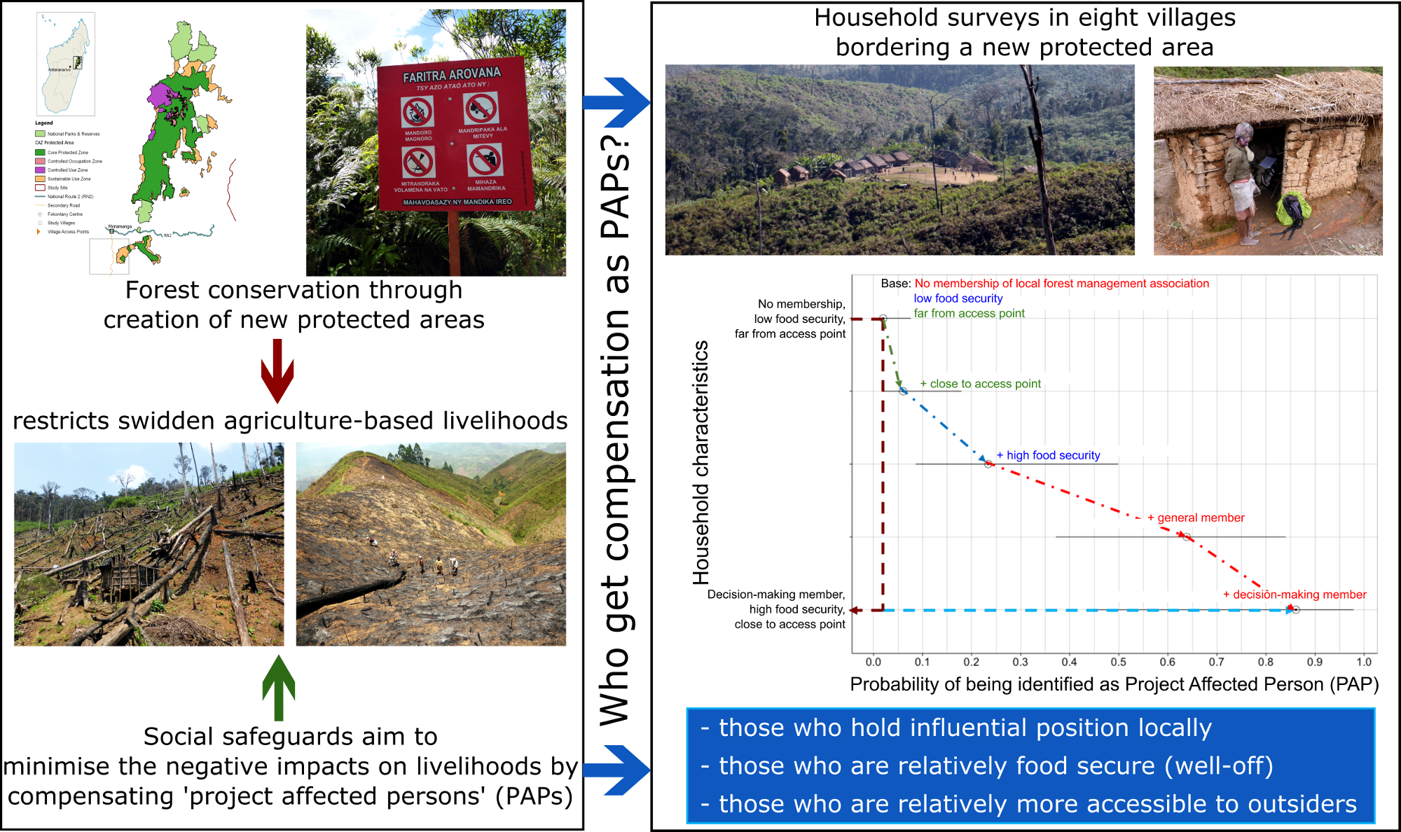Using an in-depth case study of one of the recent social safeguards implementation carried out to compensate the potential negative impacts due to the creation of a new protected area (which also has a REDD+ pilot project) in the eastern rainforests of Madagascar, we show that the identification of the PAPs was severely flawed. We found that many of the households who should have been identified as PAPs were not identified; while local elites and those households easily accessible to the outside accessors had much higher probability of being identified as PAPs. Given that recent COP21 in Paris has endorsed REDD+ as one of the main instruments in mitigating climate change and with safeguards still a major contentious issue within REDD+, our study highlights major problems within the implementation of safeguards in poor developing countries that must be dealt with if programs like REDD+ are to benefit the ‘right’ people. The graphical abstract below attempts to visually summarise our study.