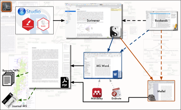 I start my initial drafts, particularly methods and results sections within RStudio, as it is where I do my data analysis and visualisation and it is simply easier to write about methods and results while they are being worked on. However, for most of my original writing, I use Scrivener, with Bookends as my reference manager. I can easily export Markdown written within RStudio in a format like RTF for Scrivener. Scrivener is one of the very best applications available for academic writing, possibly for any kind of writing, as it allows you to organise your writings in small segments, set targets (word count) and track the progress easily, as well as collate and organise research materials, such as relevant papers, snippets or any other kinds of materials. While I use my Mac for most of my writing, Scrivener is also available for Windows, I often work on Scrivener in Windows, especially in office where I have to use Windows PC. I normally use Dropbox to store my Scrivener projects so I can pick up from where I left off on any of my PCs, including on my iPad with Scrivener app. On the Mac Bookends works very well with Scrivener as a reference manager; however, if you are working on a Windows PC, you can easily use Endnote or Mendeley for reference management, and to insert citation into your write-up (as citation codes that can later be automatically scanned by reference manager like Endnote to create formatted bibliography).